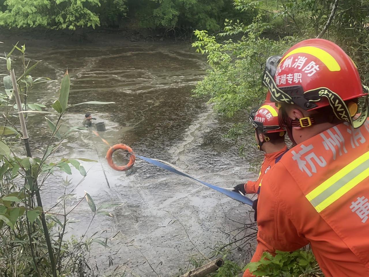 4月14日17时08分,杭州市余杭区消防救援大队指挥中心接到报警:余杭区黄湖镇王位山村灰山郎6号附近河塘内,有村民被困淤泥。