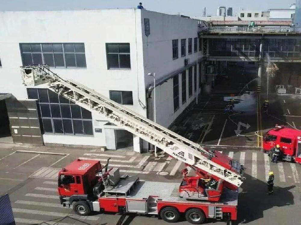 演练模拟企业废气处理装置因长期满负荷运行引发自燃。员工发现火情后立即启动应急预案,第一时间报警并组织人员疏散。消防救援力量快速抵达,确认有2名员工被困二楼车间后,升起登高平台车靠近被困人员所在窗口;同时,一组消防员铺设水枪阵地压制火势,另一组利用云梯车精准定位,成功将被困人员安全转移至地面。整个救援过程衔接紧密,行动高效,充分展现了“多方联动、快速响应”的实战效能。