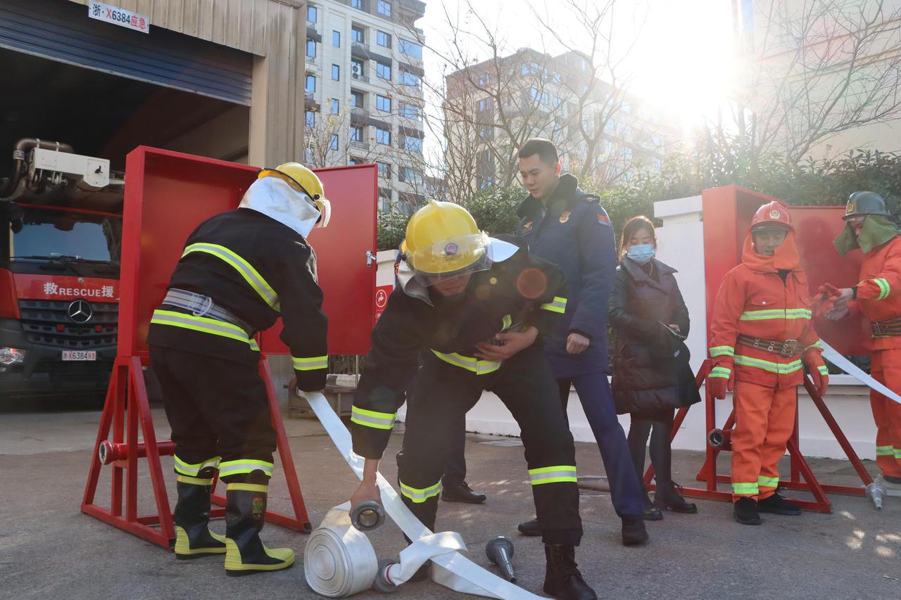 在理论学习课上,消防救援人员组织学员们观看了火灾警示案例,详细讲解了高层建筑火灾危险性、日常消防安全管理要点、隐患排查方法、安全疏散的组织与引导等专业知识。学员们认真聆听,不时与消防员积极互动,现场学习氛围浓厚。在消防实操课上,消防救援人员重点组织开展原地着灭火救援服、水枪与水带连接、消火栓使用及消防水带正确盘卷等实操科目。训练过程中,消防救援人员穿梭在参训人群中,手把手指导动作要领,面对面纠正不规范操作,确保全体学员动作规范、掌握要领。
