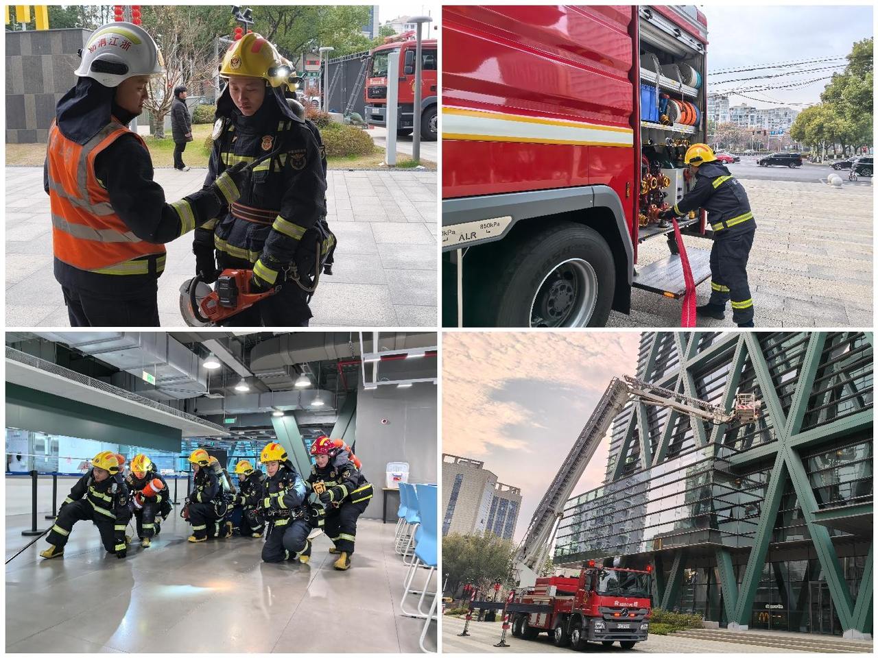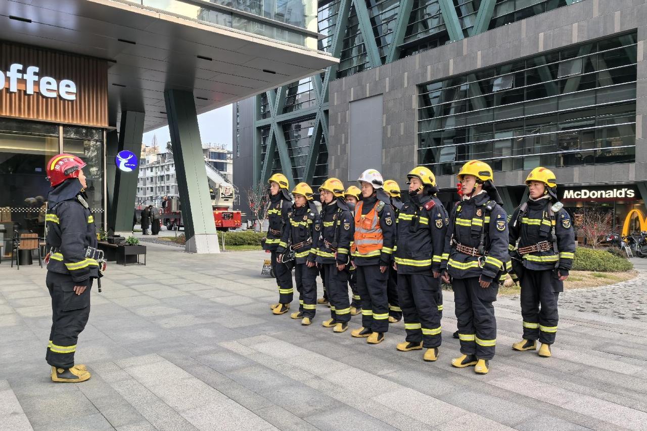 此次演练模拟中心某层突发火情,消防救援人员迅速响应,结合高层建筑火灾特点,按照作战单元编成,明确侦察、搜救、灭火、供水等岗位分工,快速完成火情侦察、人员疏散、内攻灭火等实战科目。