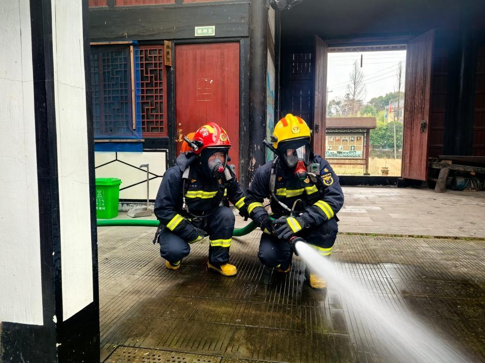 演练假设暨南街道洋湖村中戚家一2层老旧民房突发火情,火势迅速扩大蔓延,有人员被困,周边居民发现险情后,第一时间组织人员进行疏散,同时拨打119电话进行求助。