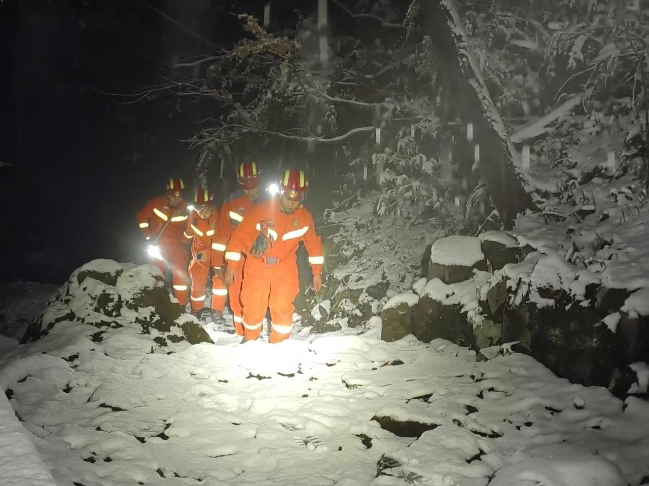彼时,山区正持续降雪,路面积雪不断增厚,路面湿滑难行,给救援工作带来极大阻碍。救援车辆行至半山腰时,因积雪过深、路况恶劣,已无法继续向前行驶。为抢抓黄金救援时间,消防员们毅然放弃乘车,选择徒步进山搜救。在零下低温、能见度极低的恶劣环境下,消防员们沿着覆雪湿滑的王位山森林古道艰难跋涉。他们一手紧握强光手电,划破深山的漆黑夜幕,一边沿途高声呼喊,试图捕捉被困者的回应;同时,持续与被困游客保持位置共享,精准锁定搜救范围,一步步向被困者靠近。