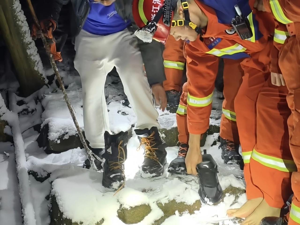 经过近1小时的艰苦搜寻,消防员们于凌晨2时38分,在古道一处偏僻路段成功找到被困者。令人揪心的是,该游客登山装备严重不足,仅携带一部手机,脚上的运动鞋早已被积雪浸透,双脚冻得僵硬麻木,长时间受冻后已出现明显失温症状,身体极度虚弱,不停念叨着寒冷。见此情形,一名消防员立即上前稳稳搀扶住他,防止其因路面湿滑不慎摔倒,同时安抚他的情绪,不断给予鼓励。为缓解被困者的寒冷,另一名消防员毫不犹豫脱下自己的抢险救援靴为他穿上,自己则光脚踩在冰冷刺骨的雪地里,换上被困者那双湿透冰冷的运动鞋。