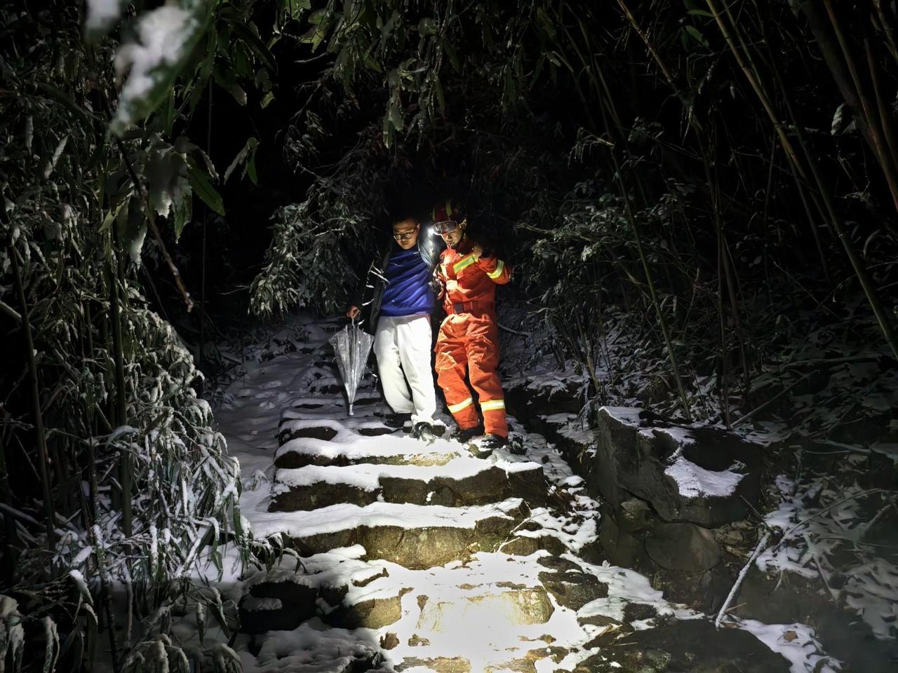 随后,消防员们一路小心护送,轮流搀扶着被困者,一步一挪地沿着湿滑的古道缓缓下山。凌晨3时18分,消防员们成功将被困游客安全护送至山下,并移交当地派出所民警做后续安置工作。据悉,该被困者是一名独自来杭旅游的年轻游客,前一晚10时便上山,原计划前往山顶民宿留宿,却因民宿闭门、电话失联,最终在白雪覆盖的山林中迷失方向。