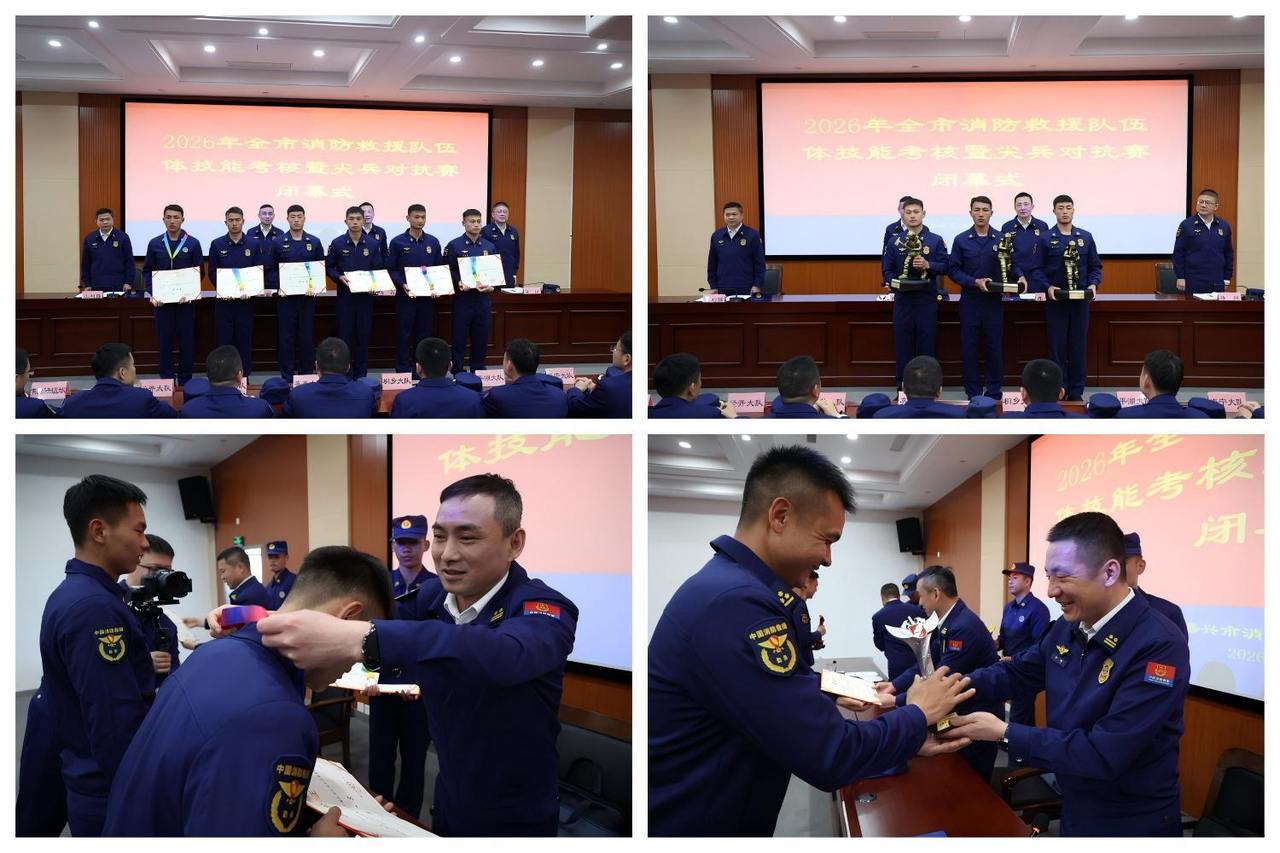 闭幕式上,与会领导为获奖集体和个人颁奖。陈银雷支队长代表支队党委向获奖人员表示祝贺,并就下一步练兵工作提出要求。他强调,要以此次考核竞赛为新起点,持续掀起全员练兵热潮,牢固树立“练基础、强本领、保打赢”的鲜明导向,扎实推进训练改革和“三支力量”体系建设,严格落实“四体系一机制”要求,全面提升练兵质效。同时,紧盯辖区灾害特点深化实战实训,严抓训练作战安全,全面提升“全灾种、大应急”综合救援能力,为守护人民群众生命财产安全和社会稳定贡献消防力量。